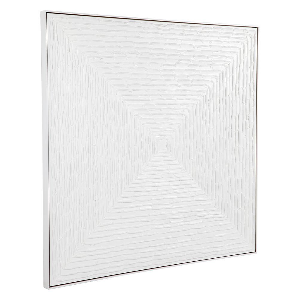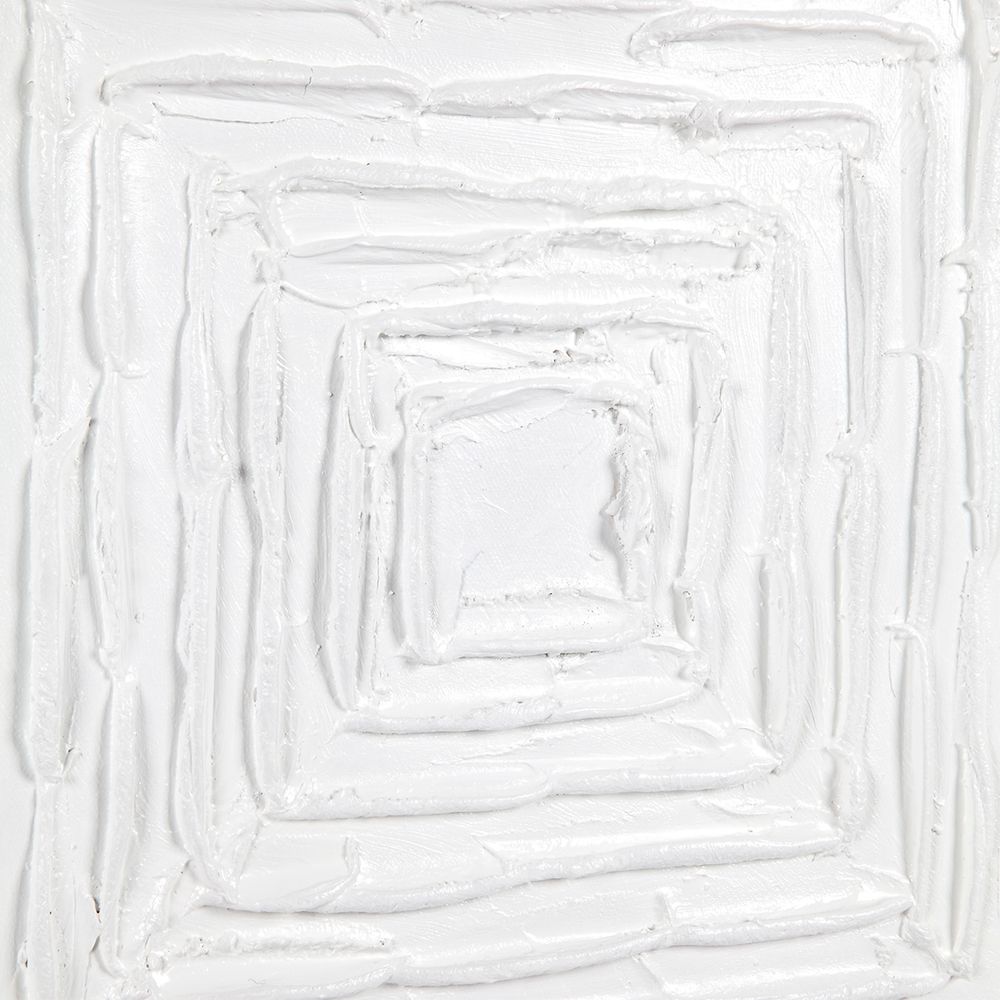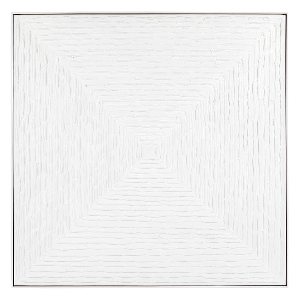 The White Vortex Oil on Canvas Painting – Large offers a serene and textured addition to your decor. Inspired by the Japanese art of Hokime found in Zen practices, this hand-painted artwork features a mesmerising progression of squares patiently applied by hand using gesso and oils. The piece evokes the Japanese ‘Wabi Sabi’ aesthetic—celebrating beauty through imperfection, embracing the roughness of nature, simplicity, and modesty. Mounted in a white shadow box frame, this 138cm square painting creates a stunning feature in any space.
