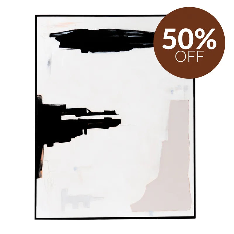 The Mystical Hues Series II Oil on Canvas Painting offers a contemporary addition to your decor. This hand-painted abstract artwork features whimsical lines and bold shapes, with tones of snow, blush, and black making way to gentle accents of peach and sky blue. The layered oils create a sense of depth and texture, making it a striking statement piece in any interior. Encased in a chic matte black shadow box frame, this oversized 110 x 140 cm painting adds a bold arrangement to your walls. Pair it with Mystical Hues Series I for an alluring juxtaposition.