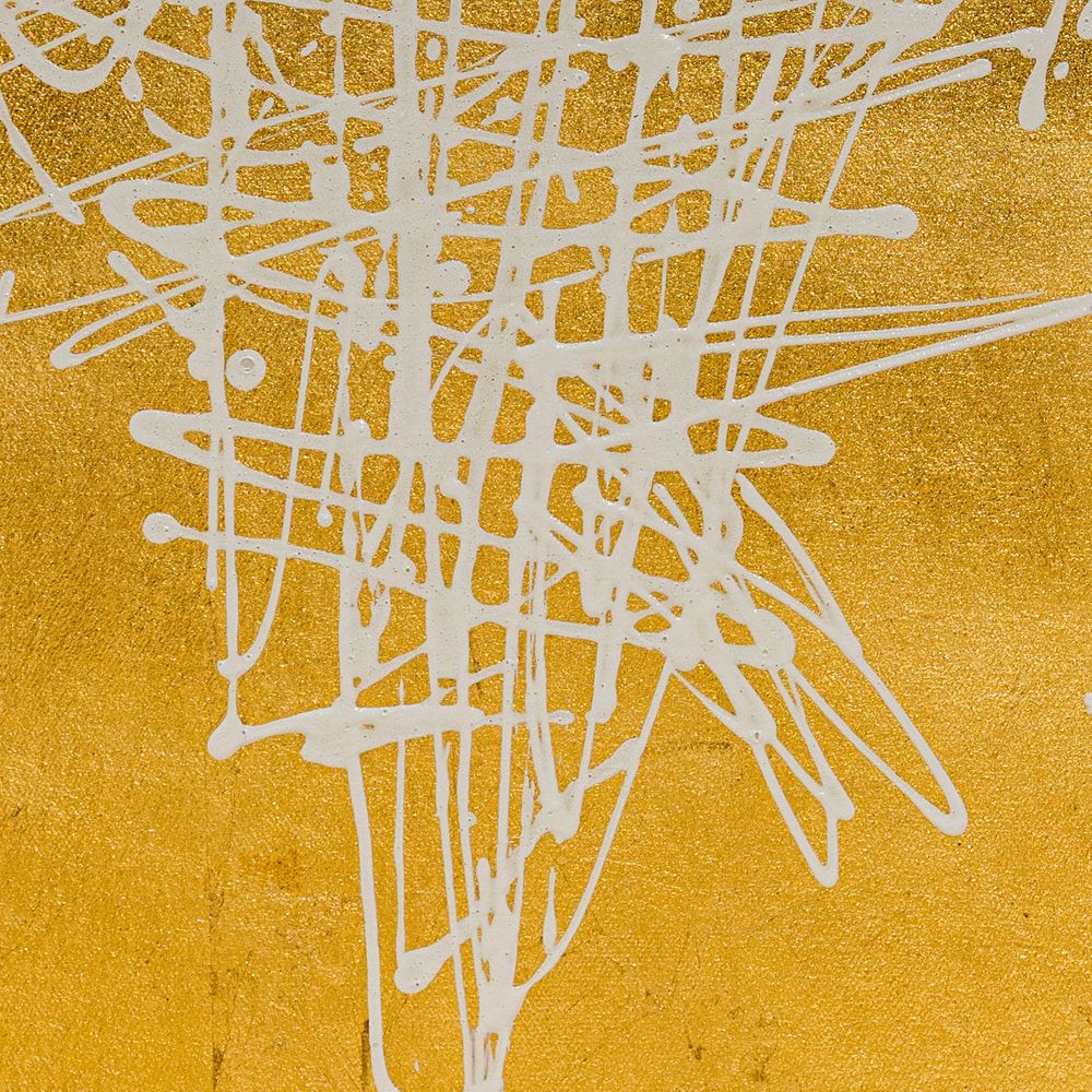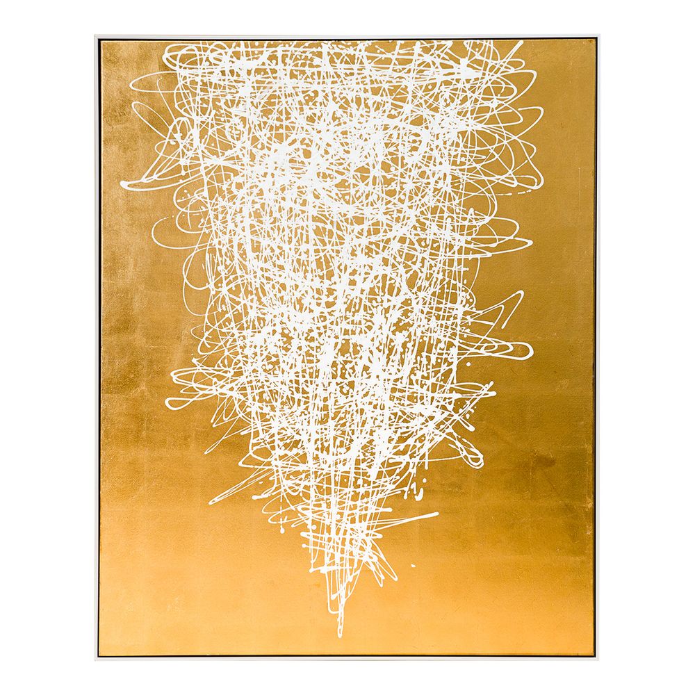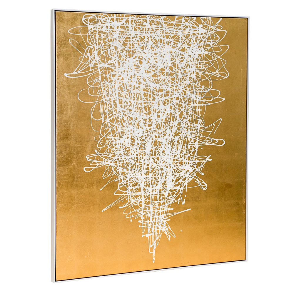 Elevate your design space with the Golden Empire Oil On Canvas Painting. A masterful blend of minimalist white abstract lines on lustrous gold leaf creates a captivating focal point. This exquisite hand-painted piece inspires sophistication and modernity, enhancing the aesthetic appeal of any interior. Encased in a refined matte white shadow box frame, the Golden Empire painting promises to complement diverse design palettes, making it an indispensable addition to your curated collection.